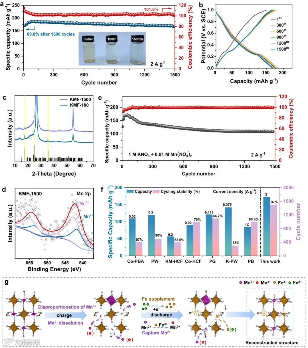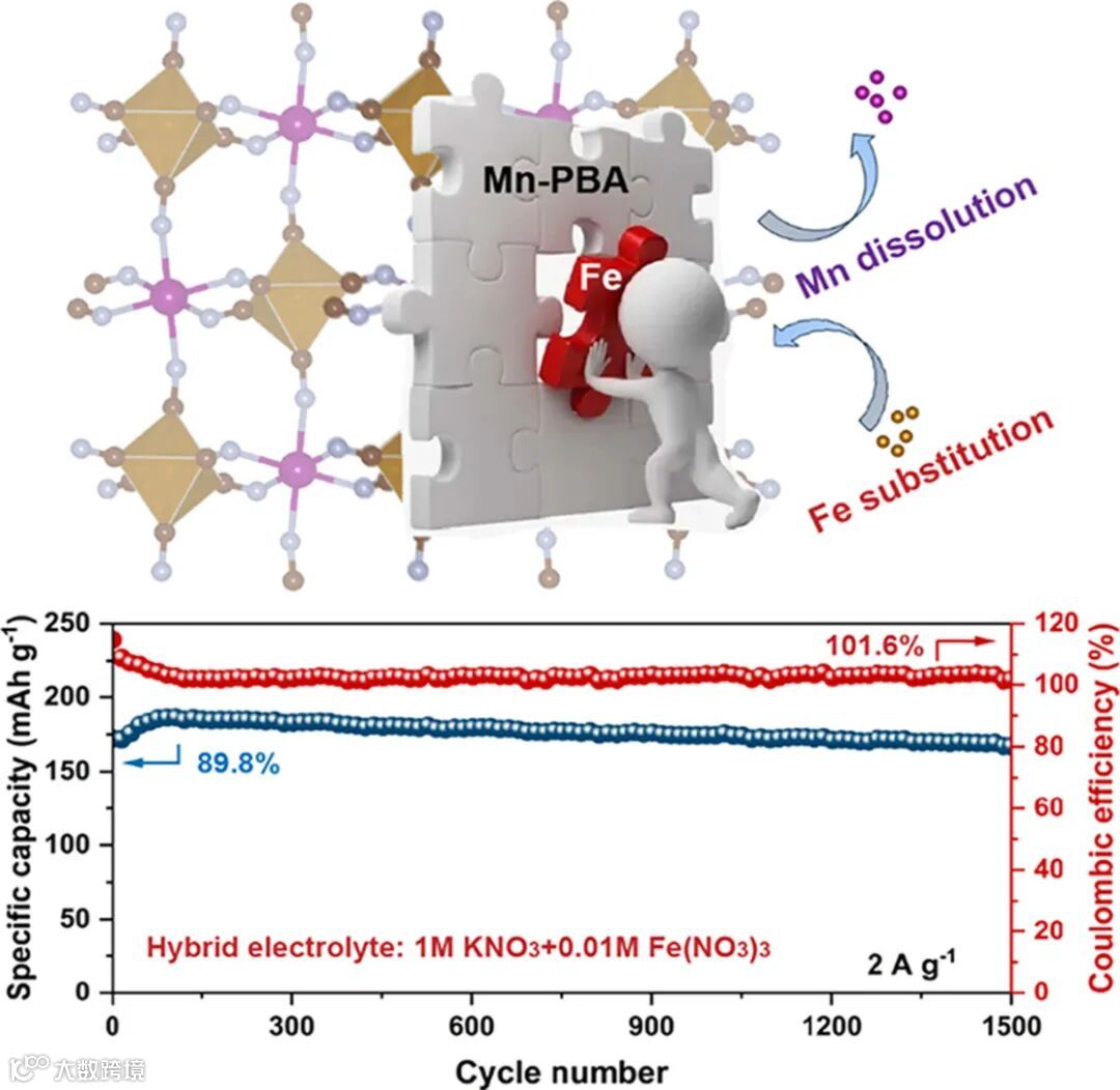 图1:高自旋Fe取代策略维持Mn-PBA结构稳定性示意图与充放电循环测试。