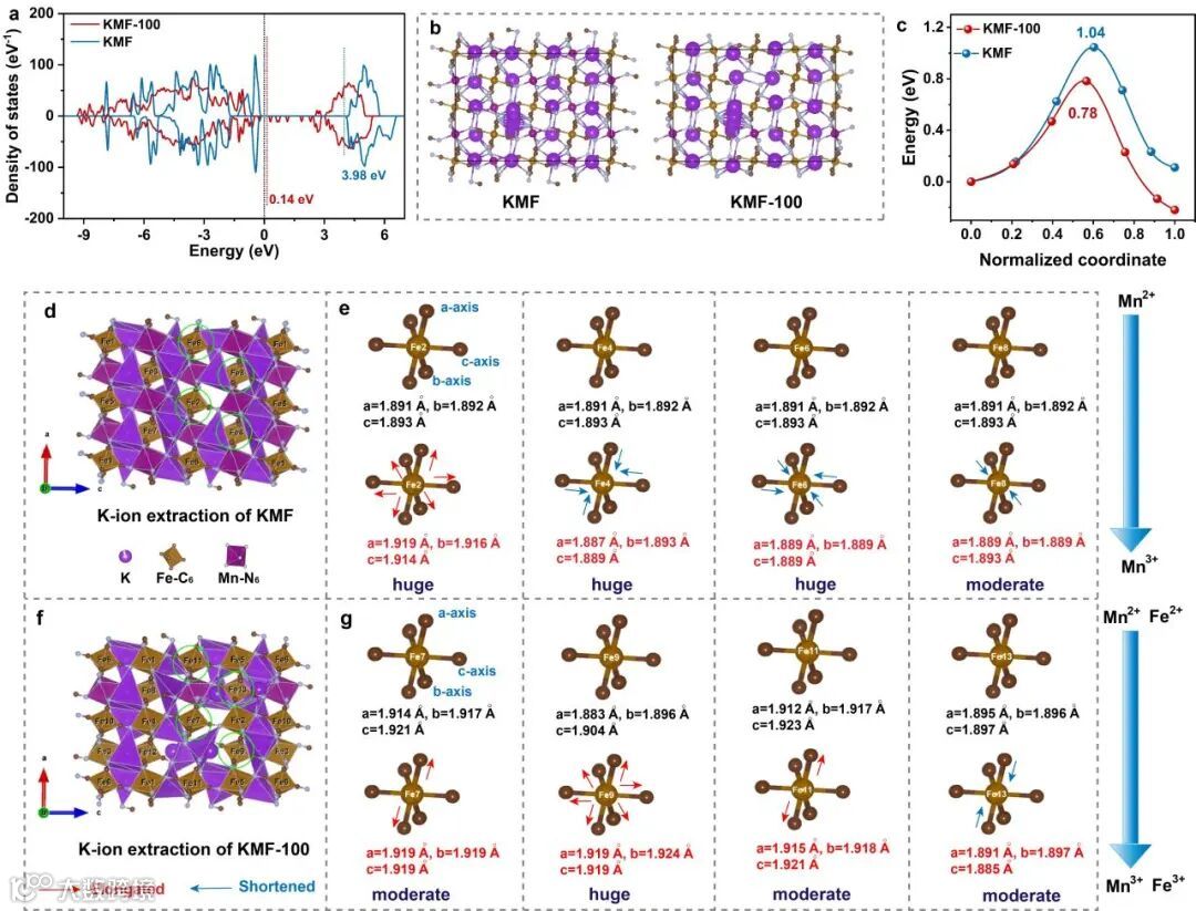 在初始电极KMF和铁取代电极KMF-100结构的态密度图中可以观察到,KMF的带隙为3.98 eV,而KMF-100的带隙为0.14 eV,表明KMF-100的导电性增强。与初始KMF结构模型相比,具有较多缺陷的Fe取代模型结构具有更低的钾离子扩散能(0.78 eV vs.1.04 eV)。该结果表明通过高自旋Fe取代策略增强材料导电性的同时,引入了更多缺陷位点,有效促进钾离子扩散。每个Fe原子与六个N原子或六个C原子相连,构成Fe-N八面体或Fe-C八面体。KMF电极在充电过程中(脱出一个钾离子后),Fe-C6八面体中的Fe发生氧化还原反应,Fe-C键长在六个方向上都有变化。由于晶格变形主要与低自旋Fe-C6八面体的变化有关,我们选择了四个具有代表性的Fe-C6八面体的位置进行计算,将Fe2、Fe4、Fe6和Fe8标记为Fe-C八面体的各个位点。DFT计算结果表明,KMF电极在脱出一个K+后,四个Fe-C6八面体中的Fe-C键长变化较大,尤其是最接近脱出钾离子位点的Fe2C6、Fe4C6和Fe6C6八面体,其Fe-C键至少在四个方向上延长,造成较大的结构形变。