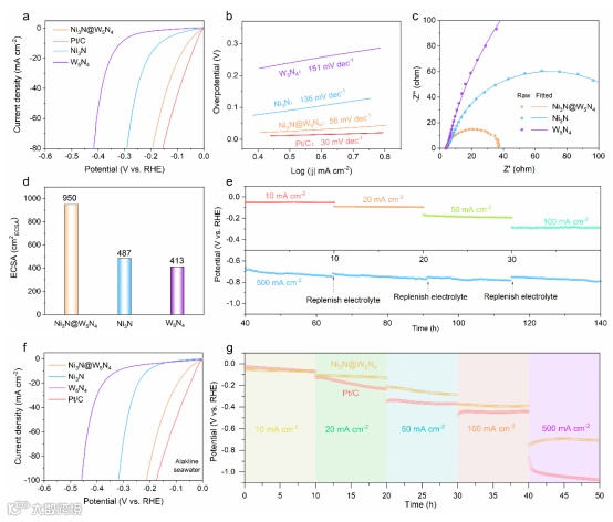 Figure 3. 催化性能测试:Ni3N@W5N4在1 M KOH以及碱性海水中表现出优异的催化活性和长期稳定性。