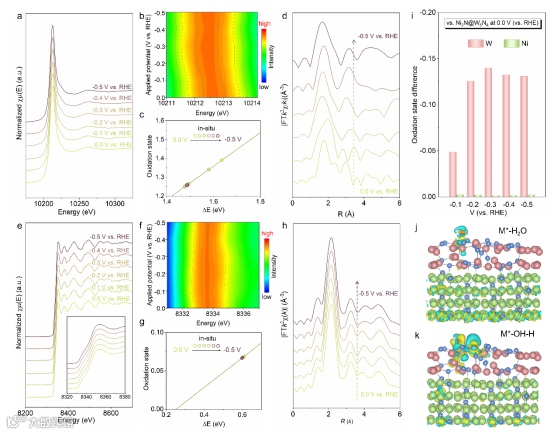 Figure 5. 原位同步辐射分析:原位XAS分析确认了W5N4壳层为碱性HER的主要活性位点。