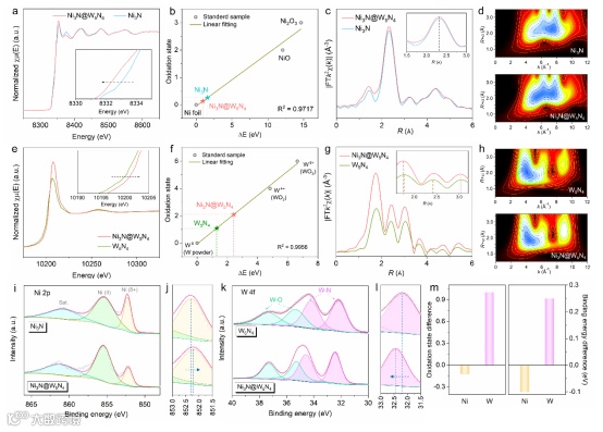 Figure 2. 催化剂电子结构分析:同步辐射和XPS分析结果揭示了BIEF的形成优化了Ni3N@W5N4结构中W5N4壳层的电子结构,显著提高了HER活性。