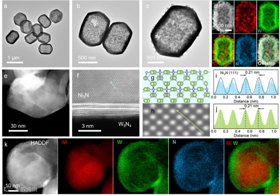 Figure 1. 催化剂的结构表征:通过HAADF-STEM和HR-TEM表征,确认Ni3N@W5N4异质结构由超薄W5N4壳层和Ni3N核组成。