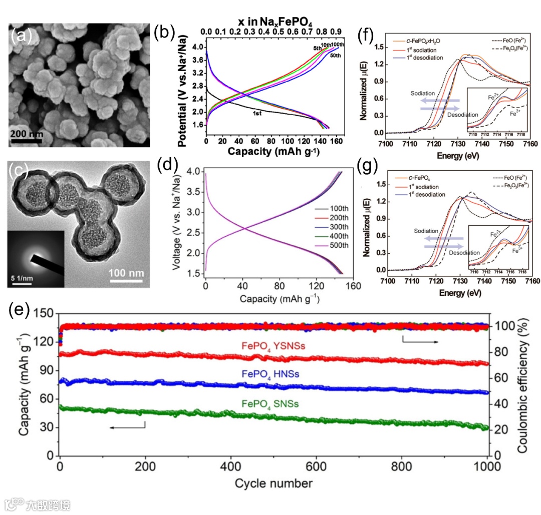 FePO4因其高理论容量(约177 mAh g−1)而受到广泛关注。然而,FePO4的循环和倍率性能较差。为了提升FePO4的电化学性能,已经进行了大量的工作,包括形态修饰、粒子尺寸缩小和碳涂层。少量的离子掺杂将是一种有效的策略,以提高材料的离子/电子导电性和结构稳定性,这值得进一步探索。