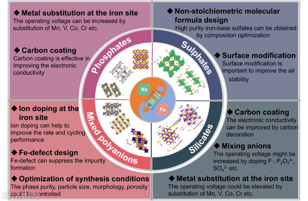 图14 改善不同铁基聚阴离子材料电化学性能的策略。