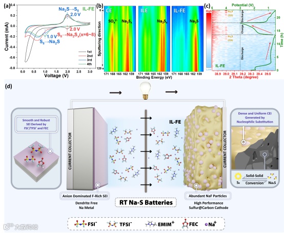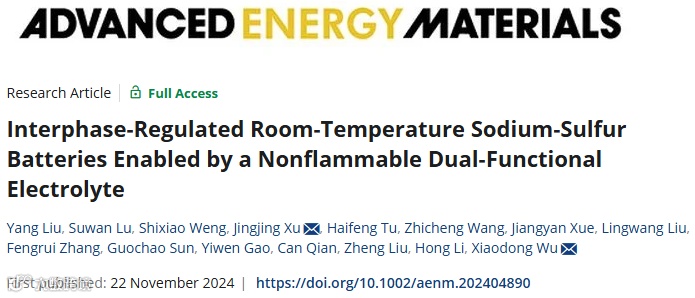 近日,中国科学院苏州纳米所吴晓东研究员、河海大学许晶晶教授与中国科学院物理研究所李泓研究员等人在《Advanced Energy Materials》期刊上以“Interphase-Regulated Room-Temperature Sodium-Sulfur Batteries Enabled by a Nonflammable Dual-Functional Electrolyte”为题,提出了一种不可燃的双功能离子液体基电解液,首次将离子液体作为室温钠硫电池电解液的主要溶剂,并对其在界面处的作用机制进行了深入的研究。通过合理的电解液工程设计和多重表征技术,深入揭示了离子液体电解液在室温钠硫电池的双功能特性以及活性硫物种的转化机制。以电解液为突破口,为高性能室温钠硫电池的开发提供了新的思路。