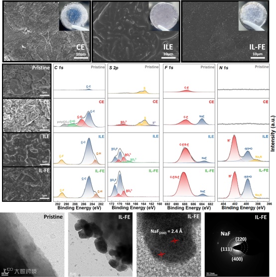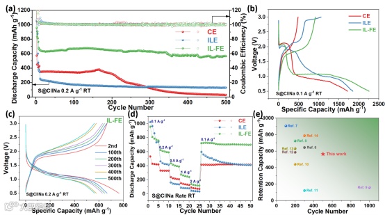 离子液体是一类由离子组成、在室温下处于液态的盐物质,具有低挥发性、高热稳定性、高电化学稳定性以及优异的离子导电能力等特点,其阴阳离子有着灵活的组合形式,是十分理想的电解液绿色溶剂。借助离子液体本征的弱溶剂化能力,电解液成功抑制了多硫化钠的生成,确保了硫的持续固-固转化,有效地避免了活性硫的损失和穿梭效应。同时其固有的不可燃性和抑制枝晶生长的能力使其与活性钠金属负极高度兼容,保证了室温钠硫电池优越的安全性。离子液体电解液大量可调节的离子促使阳离子和阴离子共同参与,形成了以氟化物、氮化物等无机组分为主的更稳定的SEI/CEI层,并在正负极侧产生了“双功能”特性。在正极侧,FSI-/TFSI-和FEC协同参与了与多硫化钠亲核加成反应,自发地形成了致密均匀的正极电解质界面(CEI)。利用高导电性无机NaF颗粒调控S@C正极表面结构,有效降低电极与电解质之间的界面阻抗,保证了快速转化动力学,显著提高了室温钠硫电池性能。在负极侧,离子液体丰富的FSI-有效地保障了以阴离子为主的固体电解质界面(SEI)的形成。因此,该电解液展现出了优异的循环稳定性,在0.2 A g-1电流下循环500圈后,剩余比容量超过560 mAh g-1,平均库仑效率接近100%。这一发现揭示了离子液体基电解液在室温钠硫电池中的应用价值。