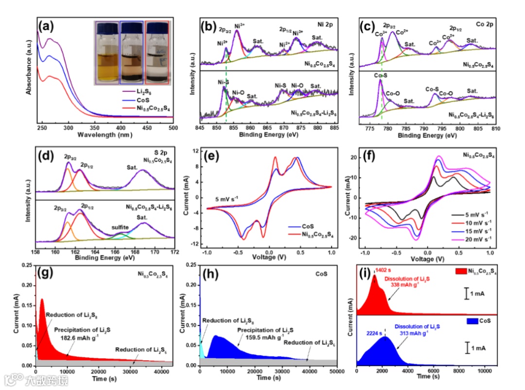 Figure 4. a) UV-vis absorption spectra of the Li2S6 solutions before and after being treated with Ni0.5Co2.5S4and CoS, the inset shows digital photos of the corresponding solutions; High-resolution XPS spectra of b) Ni 2p, c) Co 2p, and d) S 2p in Ni0.5Co2.5S4before and after Li2S6 adsorption; e) CV curves of the symmetrical cells assembled with various electrodes (Ni0.5Co2.5S4and CoS) at a scan rate of 5 mV s−1; f) CV curves of symmetrical cells assembled with Ni0.5Co2.5S4at different current rates; Potentiostatic discharge profiles at 2.04 V of Li2S precipitation with g) Ni0.5Co2.5S4and h) CoS; i) Potentiostatic charge profiles at 2.35 V of Li2S dissolution with Ni0.5Co2.5S4and CoS.