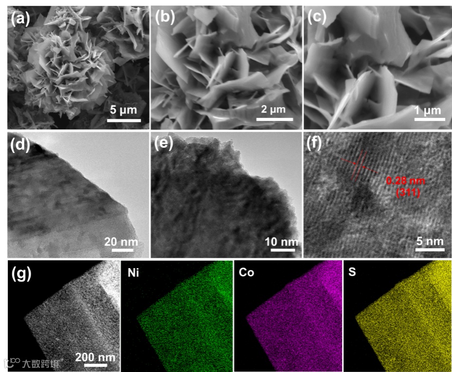 Figure 2. a-c) SEM images of Ni0.5Co2.5S4 at different magnifications; d-f) TEM and HRTEM images of the Ni0.5Co2.5S4; g) STEM images of Ni0.5Co2.5S4and corresponding EDS mappings of Ni, Co, and S elements.