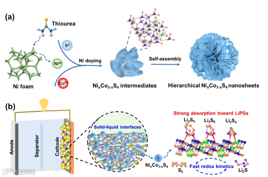 Figure 1. a) Schematic diagram for the fabrication process of NixCo3-xS4 electrocatalysts and b) the mechanism of accelerated sulfur redox kinetics at solid-liquid interfaces of the S@NixCo3-xS4/CNT cathode for Li-S battery.