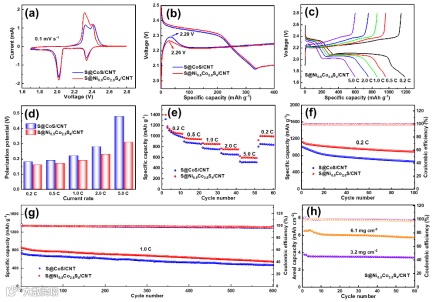 Figure 5. a) CV curves of S@Ni0.5Co2.5S4/CNT and S@CoS/CNT cathodes a scan rate of 0.1 mV s−1 in a voltage range of 1.7-2.8 V; b) GCD profiles of S@Ni0.5Co2.5S4/CNT and S@CoS/CNT cathodes at 0.2C; c) GCD profiles of the S@Ni0.5Co2.5S4/CNT cathode at different current rates; d) polarization potential, and e) the rate performance of the S@Ni0.5Co2.5S4/CNT and S@CoS/CNT cathodes at different current rates; f) Cycling performances of S@Ni0.5Co2.5S4/CNT and S@CoS/CNT cathodes at 0.2 C; g) The long-term cycling performances of S@Ni0.5Co2.5S4/CNT and S@CoS/CNT cathodes at 1.0 C for 600 cycles; h) Cycling performance of the S@Ni0.5Co2.5S4/CNT cathode with a high sulfur loading at 0.2 C.