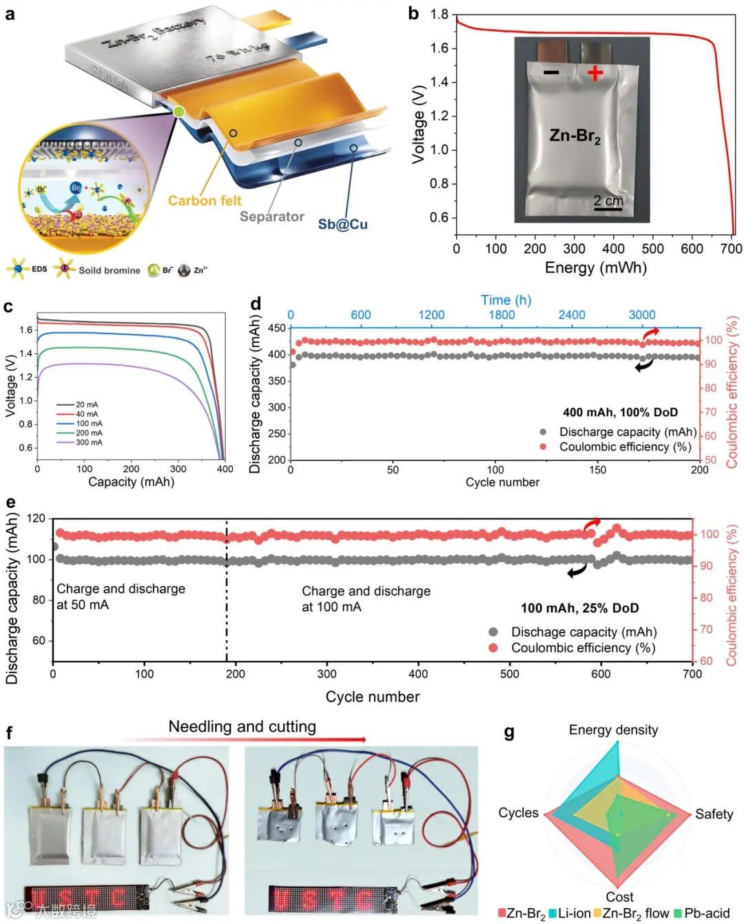 (g) 静态锌溴电池与目前商业化成熟的电池性能对比。