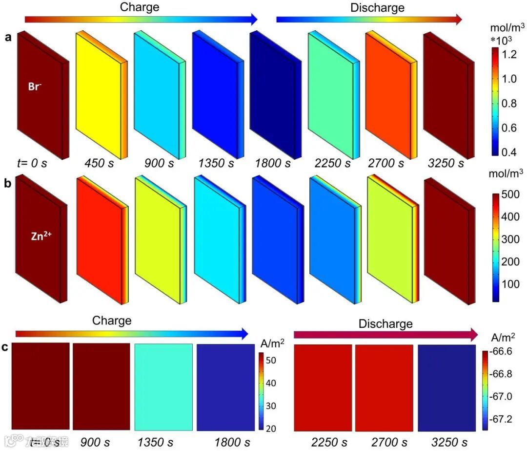 图2. 锌溴软包电池在充放电过程中电解液的离子浓度和电极上电流密度变化规律。