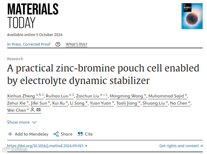 A practical zinc-bromine pouch cell enabled by electrolyte dynamic stabilizer Xinhua Zheng, Ruihao Luo, Zaichun Liu, Mingming Wang, Muhammad Sajid, Zehui Xie, Jifei Sun, Kui Xu, Li Song, Yuan Yuan, Taoli Jiang, Shuang Liu, Na Chen, Wei Chen* Materials Today