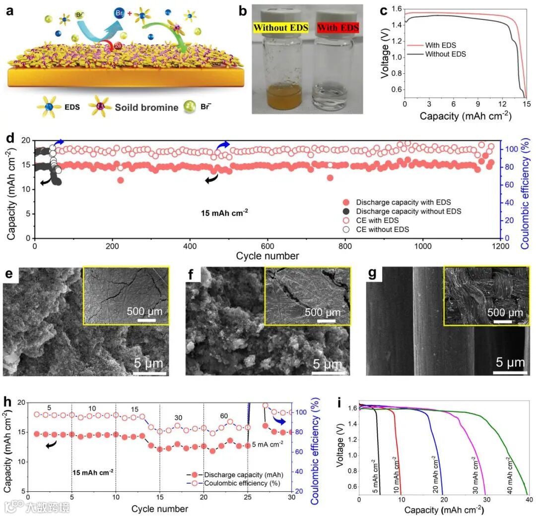 (h) 电解液动态稳定剂调控下锌溴电池在15 mAh/cm2面容量下的倍率性能。