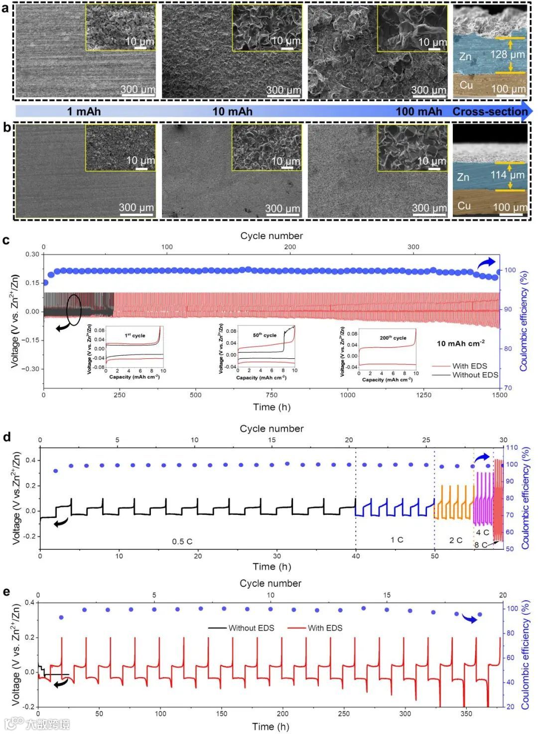 (a)和(b)分别为锌在不同电解液中沉积不同面容量下的形貌:(a) 不含动态稳定剂;(b)含有动态稳定剂。