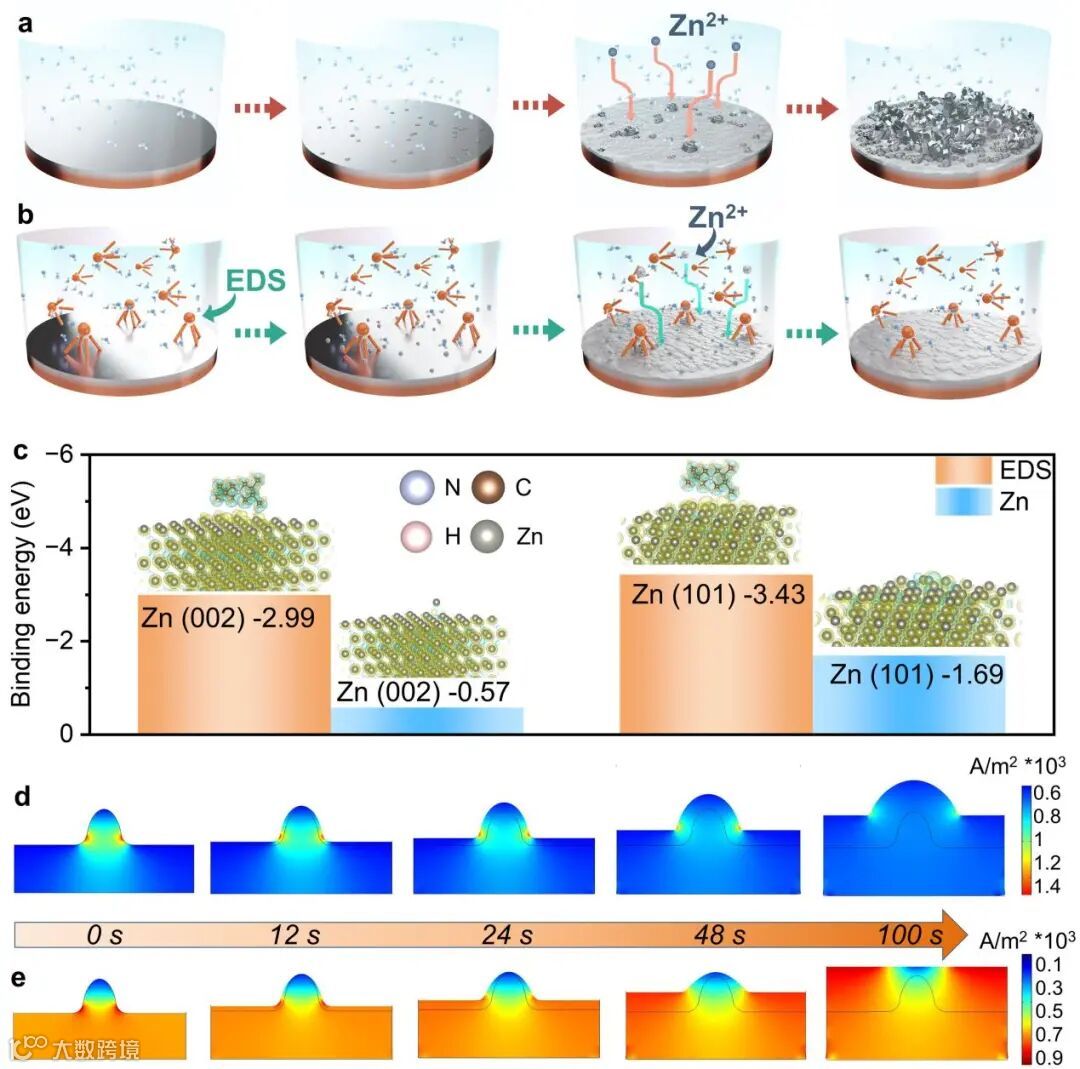 (c) 锌原子和动态稳定剂阳离子在锌电极表面的吸附能。