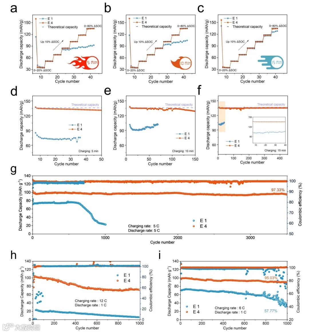 本工作绕开弱溶剂化和溶剂−稀释剂电解液策略,直接调节供体−Li+作用力构建理想的溶剂化鞘层结构,实现极短充电时间(5 min)下0~80%的ΔSOC和超高充电倍率(6 C)。