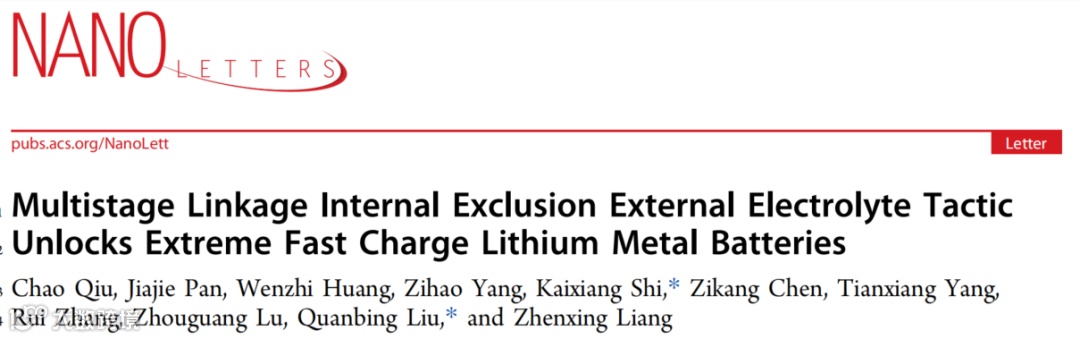近日,来自广东工业大学的石凯祥副教授与刘全兵教授,在国际知名期刊Nano Letters上发表题为“Multistage Linkage Internal Exclusion External Electrolyte Tactic Unlocks Extreme Fast Charge Lithium Metal Batteries”的文章。该文章分析了当前限制锂金属电池超快充几个决速步骤,包括缓慢SEI相传输和浓差极化导致的强负电场,受到溶剂化鞘层微观环境的启发,提出多组分挤压联动策略形成高介电常数外溶剂化鞘层和富阴离子内溶剂化层应对上述问题。