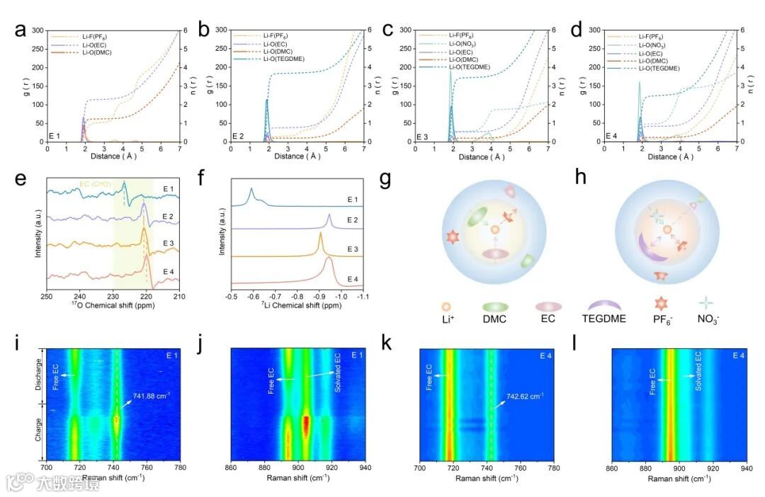 分子动力学模拟和NMR证明溶剂化鞘层级联关系遵循NO3− → G4→ EC→ DMC,DN值是导致本次挤压联动的主要原因,空间位阻和螯合作用作为次要因素。首先,高介电常数的EC极易排斥DMC占据内溶剂化鞘层(电解液E 1);具有更多锂离子配位点的TEGDME排斥EC占据内溶剂化鞘层(电解液E 2);高DN值且最小空间位阻的NO3−排斥TEGDME占据内溶剂化鞘层(电解液E 3~E 4)。最终,形成富阴离子内溶剂化鞘层和高介电常数外溶剂化鞘层。