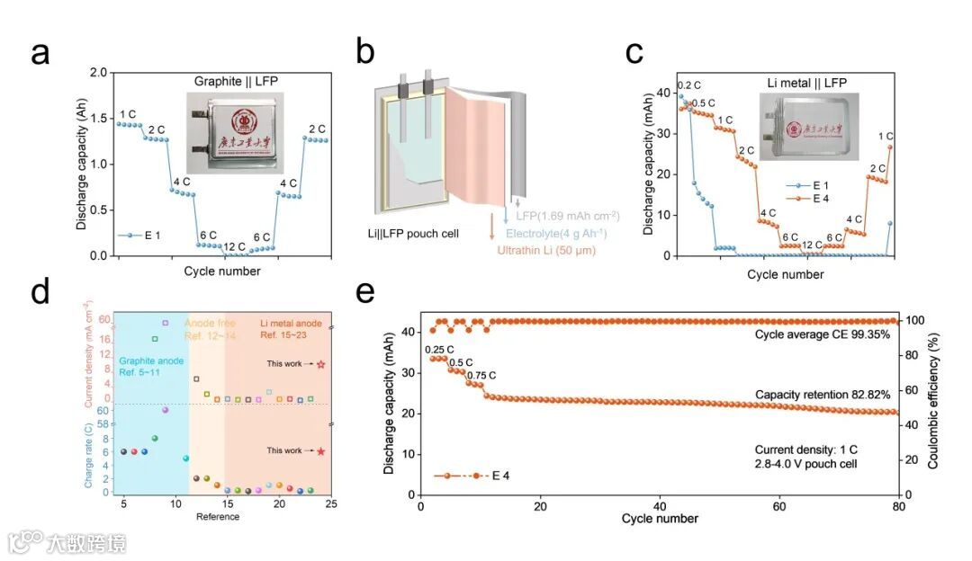 基于快速的界面离子迁移/转化动力学,在阶梯式ΔSOC、0~80%ΔSOC、快充快放和快充慢放性能测试中,均发挥了出色的放电比容量,并在软包电池中展现出极高的充电速率和充电电流密度。