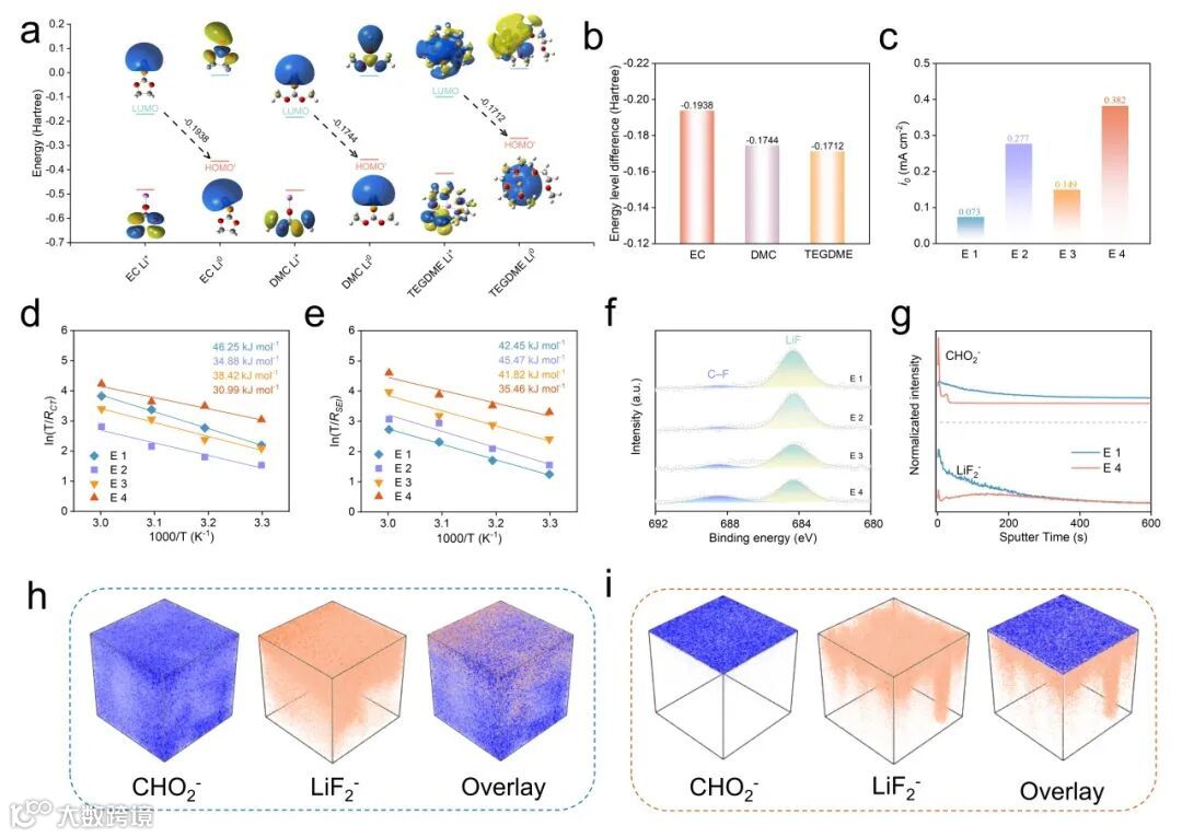 得失电子前后能级差(ΔE= HOMO′ − LUMO)反映不同溶剂下得失电子轨道的软/硬度。交换电流密度和反应活化能体现不同组分占据内溶剂化鞘层对SEI迁移和电荷转移的影响。TOF-SIMS证实E 4电解液形成了更薄的SEI(更薄的有机组分)。