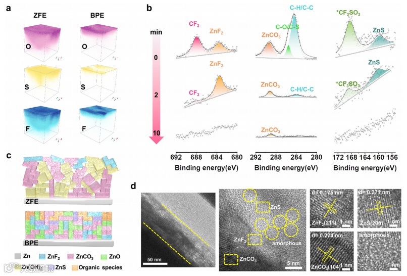 图4.(a)TOF-SIMS表征及元素分布;(b)BPE锌负极不同刻蚀时间的XPS;(c)固态电解质界面示意;(d)固态电解质界面TEM表征。
