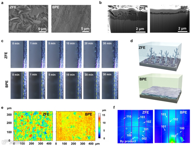 图5.(a)SEM表征;(b)FIB表征;(c)原位光学显微镜观测锌沉积;(d)锌负极界面结构示意;(e)激光共聚焦扫描显微图像;(f)2D-XRD图像。
