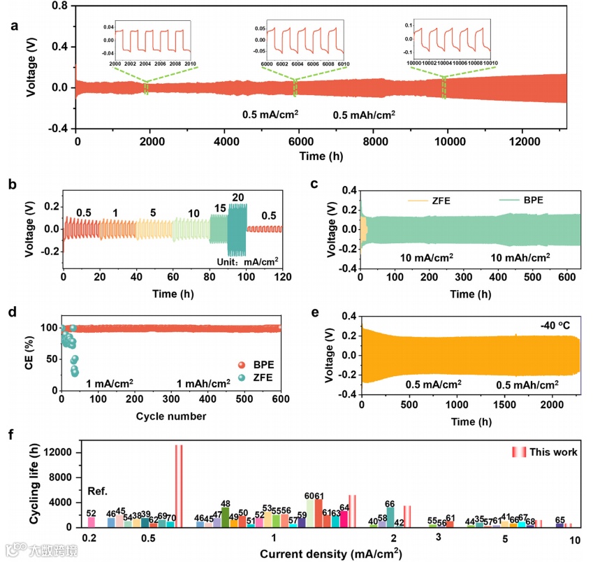 使用BPE电解液组装电池进行性能测试,对称电池在0.5 mA/cm2、0.5 mAh/cm2的条件下,稳定循环超过13000 h,是目前最高记录。此外,也展现出优异的倍率性能和高DOD性能。在1 mA/cm2、1 mAh/cm2的条件下循环600圈后,还能保持99.85%的库伦效率。在-40 ℃和-20 ℃下分别能够稳定循环2300小时和4500小时。超长的循环寿命说明由于BPE电解液的双连续相纳米结构,赋予了锌负极优异的可逆性。