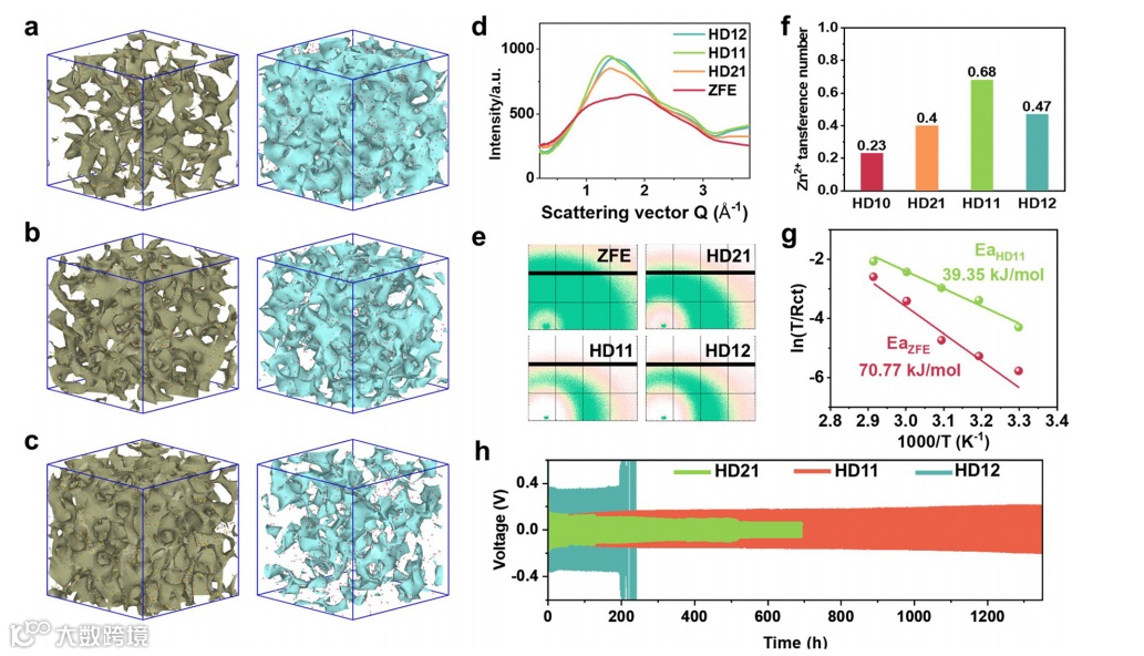 图2. (a-c)HD21、HD11、HD12电解液中DMSO(左)以及H2O(右)的等值面图;(d-e)电解液的1D/2D-WAXS结果;(f)锌离子迁移数;(g)活化能;(h)-60 ℃下Zn//Zn电池性能。
