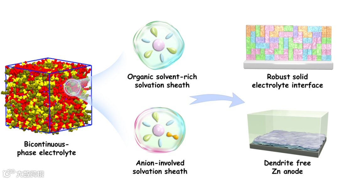 图1. 双连续相电解液实现超低温下高效稳定锌金属负极示意图