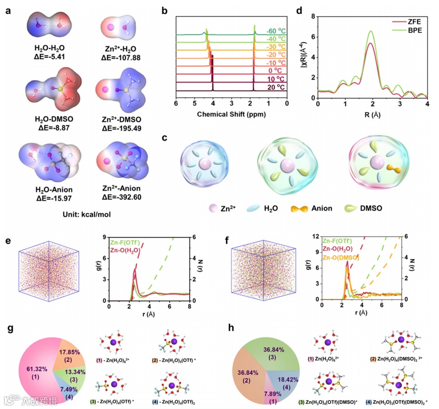 图3. (a)BPE组分间的静电势分布以及结合能;(b)BPE的变温1H NMR结果;(c)溶剂化结构:标样(左),BPE(中、右);(d)电解液EXAFS图谱;(e)标样电解液以及(f)BPE电解液的分子动力学模拟及径向分布函数;(g)标样电解液以及(h)BPE电解液的溶剂化结构统计。