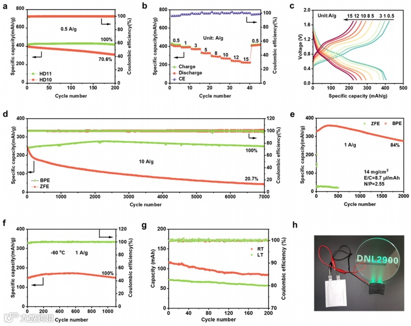 图7. a)小电流比容量曲线;(b)倍率性能;(c)不同电流条件下比容量;(d)大电流稳定性测试;(e)贫电解液、高载电池性能;(f)-60 ℃电池性能;(g)软包性能;(h)软包展示。