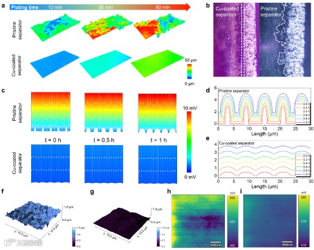 图2. a) 在10、30和60分钟后,使用不同隔膜在5 mA cm−2电流密度下的原位光学3D景深显微镜图像。b) 使用光学显微镜观察到在镀层10 mAh cm−2后的隔膜和锌阳极的截面图像。c) 在2 mA cm−2电流密度下,使用不同隔膜的电场分布模拟。模拟了d)原始隔膜和e)铜涂层隔膜在不同镀层时间下的锌沉积模型。f) 使用原始隔膜和g) 铜涂层隔膜在电镀后的锌阳极表面的AFM图像。h) 使用原始隔膜和i) 铜涂层隔膜在100次循环后的锌阳极表面的KPFM图像。