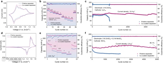 使用原始隔膜和铜涂层隔膜组装的Zn||Zn对称电池在1-10 mA cm²的电流密度下评估了锌阳极的长期镀/剥离性能。铜涂层隔膜的电池提供了超过3500小时(1 mA cm−2,1 mAh cm−2)的超长循环寿命,并且过电位更低,表明铜涂层隔膜具有更低的电荷传递阻力。在8 mA cm−2的电流密度下,铜涂层隔膜的Zn||Zn对称电池累积容量高达10800 mAh cm−2。铜涂层隔膜能够维持高深度放电(DOD)下的稳定循环,即使在94%的高DOD下也能稳定循环超过200小时。铜涂层隔膜改善了锌的可逆性并抑制了锌枝晶的生长,而使用原始隔膜的电池则观察到快速短路。在不同电流密度下测试了不同隔膜的锌镀/剥离性能,铜涂层隔膜的电池过电位稳定上升,而原始隔膜的电池因短路而导致极化急剧增加。铜涂层隔膜的电池具有更高的库仑效率(CE)和更好的镀/剥离稳定性。在2 mA cm−2的电流密度下,铜涂层隔膜的电池平均CE为99.88%,而原始隔膜的电池在200个循环后CE波动较大,甚至短路。在不同电流密度下测试了半电池的倍率性能,铜涂层隔膜的电池在不同电流密度下具有最小的尖端电位和生长电位,有利于锌的均匀成核和快速沉积,而原始隔膜的电池非常不稳定,并伴随着过电位。