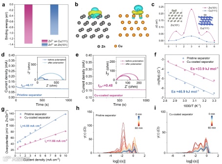 图3. a) 计算Zn2+在Zn(101)和Cu(111)晶面上的结合能。b) 锌原子吸附在Zn(101)和Cu(111)晶面上的电荷密度分布差异。c) Zn2+通过不同路径扩散的迁移能垒。d) 使用原始隔膜和e) 铜涂层隔膜的Zn||Zn对称电池的CA曲线。f)Arrhenius曲线及对应的活化能。g) 交换电流密度对比。h) 使用原始隔膜和i) 铜涂层隔膜的对称Zn||Zn的EIS数据的DRT图。