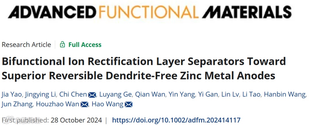 双功能离子整流层隔膜助力实现无枝晶锌金属阳极