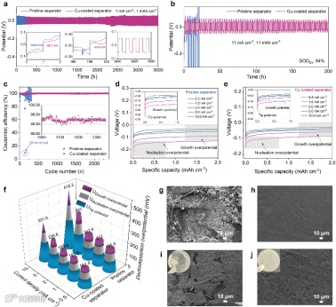 图4. a) 使用不同隔膜在1 mA cm−2和1 mAh cm−2条件下Zn||Zn对称电池的长期恒流循环。b) 不同隔膜的Zn||Zn电池在94%DOD下的循环性能。c) 使用不同隔膜的Zn||Ti电池在锌沉积/剥离过程中的库仑效率。d) 原始隔膜和e) 铜涂层隔膜在不同电流密度下的电压-容量曲线。f) 使用不同隔膜在不同电流密度下的沉积过电位。g) 使用原始隔膜和h) 铜涂层隔膜沉积5 mAh cm−2的SEM图像。i) 原始隔膜和j) 铜涂层隔膜循环50次后锌阳极的SEM图像。