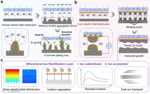 图1. 锌在隔膜与锌金属阳极之间沉积的示意图:a) 使用原始隔膜;b) 使用铜涂层隔膜。c) 双功能离子整流层作为离子重新分布器和离子加速器。