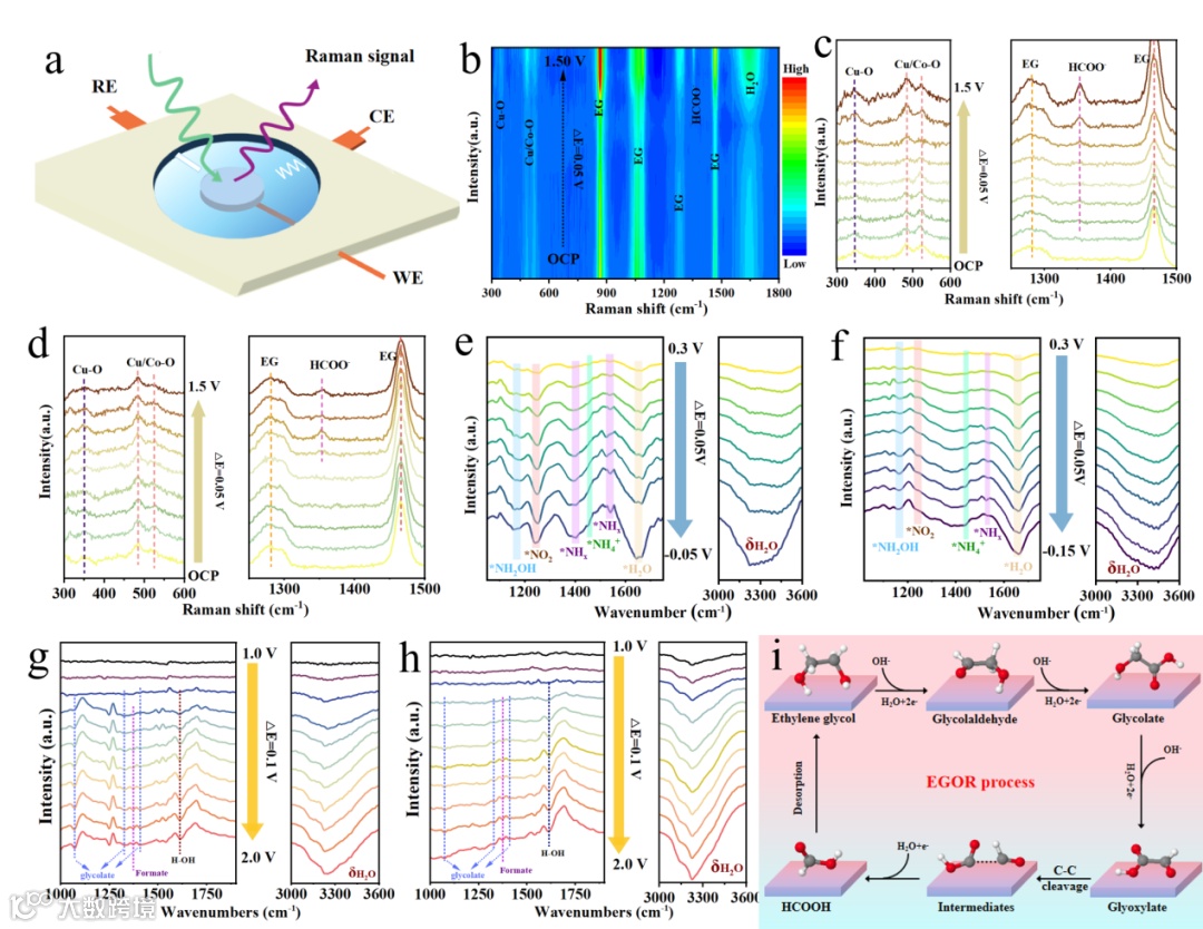 Cu@CoCu LDH/CC和CoCu LDH/CC样品在300 ~ 600 cm−1的测试范围内都表现出347、481和520 cm−1的拉曼峰,这可以归因于Cu−O和Cu/Co−O在CoCu LDH/CC中的振动模式。位于1280和1468 cm−1处的宽而尖锐的峰是EG反应物的信号,而出现在1353 cm−1处是生成的甲酸产物的特征峰。同时Cu@CoCu LDH/CC生成甲酸的初始电位为1.2 V vs RHE,低于CoCu LDH/CC (1.35 V vs RHE),证实了其在选择性电化学氧化EG生成甲酸方面具有高活性。如图3e−f,可以观察到Cu@CoCu LDH/CC催化剂对NO3RR的七个主要吸收带。1240 cm−1处的向下吸收带对应于生成的*NO2中间体中N−O的反对称伸缩振动。随着电位的负增加,在1170 cm−1、1400 cm−1、1539和1460 cm−1处的向下吸收带分别归属于关键的*NH2OH和*NHx中间体以及形成的-NH4+产物。最后,在1650和3350 cm−1处有明显的向下吸收宽峰,则对应于水的-O−H弯曲模式和拉伸振动。Cu@CoCu LDH/CC上关键的*NH2OH和*NHx中间体的吸收带强度明显强于CoCu LDH/CC,表明其对NO3RR的反应动力学更有利。对于EGOR的原位FTIR光谱,随着施加电位的增加,在1071、1320和1411 cm−1处出现的吸收带对应于乙醇酸中间体的醛拉伸、C−O拉伸和对称COO−拉伸(图3g,h)。在1380 cm-1处的吸收峰可以确定生成的甲酸产物,Cu@CoCu LDH/CC也比CoCu LDH/CC表现出更明显的关键中间体和甲酸产物信号,表明其具有更好的EGOR性能。