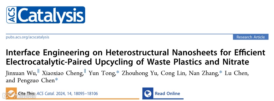 近日,来自浙江理工大学化学与化工学院的陈鹏作研究员和童赟副教授,在国际知名期刊《ACS Catalysis》上发表题为“Interface Engineering on Heterostructural Nanosheets for Efficient Electrocatalytic-Paired Upcycling of Waste Plastics and Nitrate”的文章。建立硝酸还原反应(NO3RR)和聚对苯二甲酸乙酯衍生乙二醇氧化反应(EGOR)的共电解系统,对废塑料和硝酸废水的电催化配对升级利用具有重要意义。然而,在开发高活性催化电极方面仍然面临着巨大的挑战。为此,该团队开发了一种电沉积界面调控策略,实现了系列Cu修饰的CoCu层状双氢氧化物异质结构纳米片(Cu@CoCu LDH/CC)电极的可控制备。膜电极NO3RR||EGOR电解槽证实了Cu@CoCu LDH/CC的良好催化性能,包括甲酸盐和NH3的最大法拉第效率(在1.3 V时为98.1%/98.6%),NH3的高产率(在1.6 V时为0.793 mmol h−1 cm−2)和在1.3 V下超过120 h的稳定性,优于其他报道的共电解系统。与此同时,通过原位光谱和理论计算证实电子结构和反应能垒的优化及关键催化材料和反应中间体的形成。