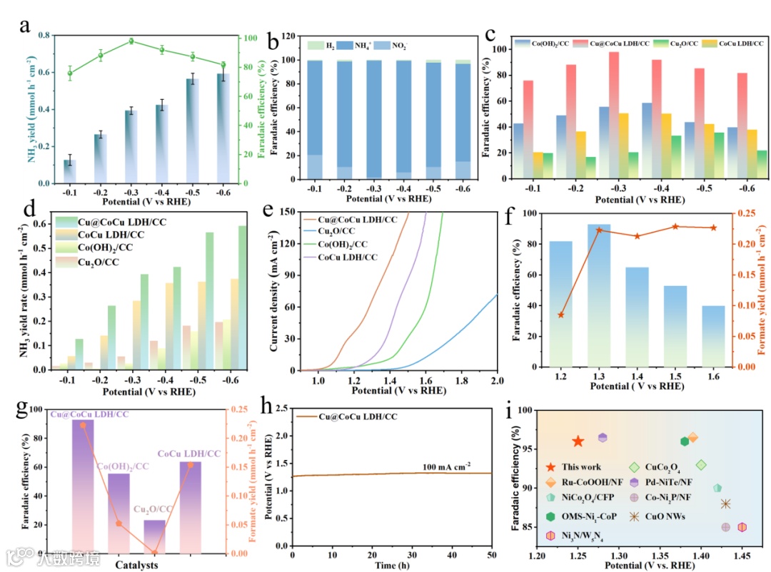 如图2a所示,Cu@CoCu LDH/CC在- 0.6 V vs RHE条件下NH3产率最高为0.594 mmol h−1 cm−2,在- 0.3 V vs RHE条件下NH3FE最高为96.2%。如图2e所示,无论起始电位或相同电位下的电流密度,Cu@CoCu LDH/CC的EGOR催化活性都优于其他三种样品,且Cu@CoCu LDH/CC催化剂在低电位(1.3 V vs RHE)下获得了高FE和甲酸产率(93.0%,0.223 mmol h−1 cm−2),同时,电势在100 mA cm−2下长期电解50小时后保持稳定(图2h)。