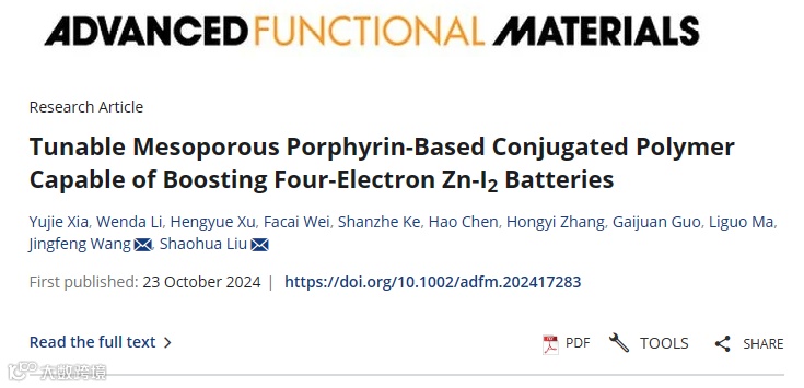 近日,纳米技术及应用国家工程研究中心王敬锋研究员和华东师范大学刘少华教授合作,在国际知名期刊Advanced Functional Materials上发表了题为“Tunable Mesoporous Porphyrin-Based Conjugated Polymer Capable of Boosting Four-Electron Zn-I2 Batteries”的研究论文。该研究通过在卟啉基共轭聚合物(PCPs)中引入可调控的介孔结构,实现了对四电子Zn-I2电池性能的显著提升。通过胶体介导的自组装方法,研究团队成功构建了具有有序介孔通道的PCPs(mPCPs),这种结构不仅增加了比表面积,还改善了氯化碘分子的锚定特性。优化的电解液传输和极性官能团的增加可及性,使得mPCPs成为一种理想的纳米反应器,用于高效协同稳定四电子I+/I2/I−转换过程。这项工作为精确控制和工程化介孔结构提供了新方法,为多电子能量存储应用的先进材料开发提供了新的方向。