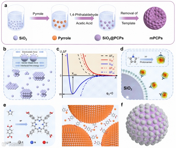 图1. mPCPs的合成与结构示意图。(a) 展示了通过胶体硅诱导的自组装过程合成mPCPs的示意图。(b) 展示了胶体二氧化硅通过各种力自组装形成球形组装体的示意图。(c) 展示了水溶液中正电荷(红线)和负电荷(蓝线)粒子对总相互作用自由能的贡献:包括静电排斥力∆Fel(黑色虚线;适用于两种电荷符号);界面溶剂化贡献∆Fint,其依赖于电荷符号(虚线);以及总相互作用能Utot=∆Fel+∆Fint(实线)。(d) 展示了质子化的吡咯和二氧化硅在静电相互作用下形成SiO2@吡咯复合组装体的示意图。(e) 展示了在乙酸催化下,吡咯和1,4-邻苯二甲醛聚合形成卟啉框架的过程示意图。(f) 展示了所得SiO2@PCPs复合纳米球的示意图。