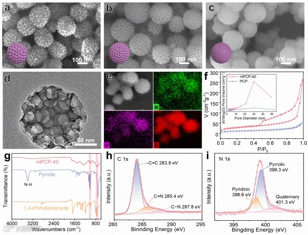 图2. mPCPs的结构表征。(a) mPCP-40,(b) mPCP-20,(c) mPCP-12的扫描电镜图像。(d) mPCP-40的透射电镜图像。(e) mPCP-40的元素分布图。(f) mPCP-40(红线)和PCP(蓝线)样品的N2吸附-脱附等温线及其相应的孔径分布。(g) mPCP-40、吡咯和1,4-邻苯二醛样品的傅里叶变换红外光谱(FT-IR)。(h, i) mPCP-40样品在C 1s和N 1s区域的高分辨率X射线光电子能谱(XPS)分析。