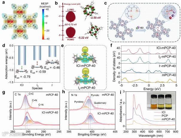 图3. mPCPs的结构和电子特性示意图。(a) mPCPs结构单元的静电势(ESP)。(b) mPCPs的HOMO和LUMO。(c) mPCP-40锚定一氯化碘的电荷转移机理。(d) 在mPCP-40上对一氯化碘、I2和I−的吸附能。(e) 一氯化碘和I2在mPCP-40上吸附的电荷差分密度的优化模式。(f) ICl-mPCP-40、I2-mPCP-40、I−-mPCP-40和mPCP-40的态密度分析。(g,h) mPCP-40在一氯化碘吸附后的高分辨率XPS C 1s,N 1s光谱差异。(i) mPCP-40的紫外-可见光谱分析和空白对照组、mPCP-40和PCP在24小时后对一氯化碘的可视化吸附(插图)。