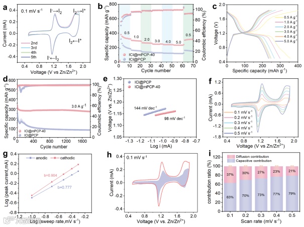 图4. 水系锌碘电池中阴极的电化学性能。(a) ICl@mPCP-40在0.1 mV s⁻¹时的循环伏安(CV)曲线。(b) ICl@mPCP-40和ICl@PCP电极的倍率性能。(c) ICl@mPCP-40电极在不同电流密度下的恒流充放电(GCD)曲线。(d) ICl@mPCP-40电极的循环性能。(e) 从ICl@mPCP-40和ICl@PCP电极的CV曲线中得到的Zn-I2氧化过程的Tafel图。(f) ICl@mPCP-40电极在不同扫描速率下的CV曲线。(g, h) 计算了0.1 mV s⁻¹下ICl@mPCP-40电极的电容和扩散控制贡献。(i) 电极ICl@mPCP-40在不同扫描速率下的电容性和扩散性的贡献。