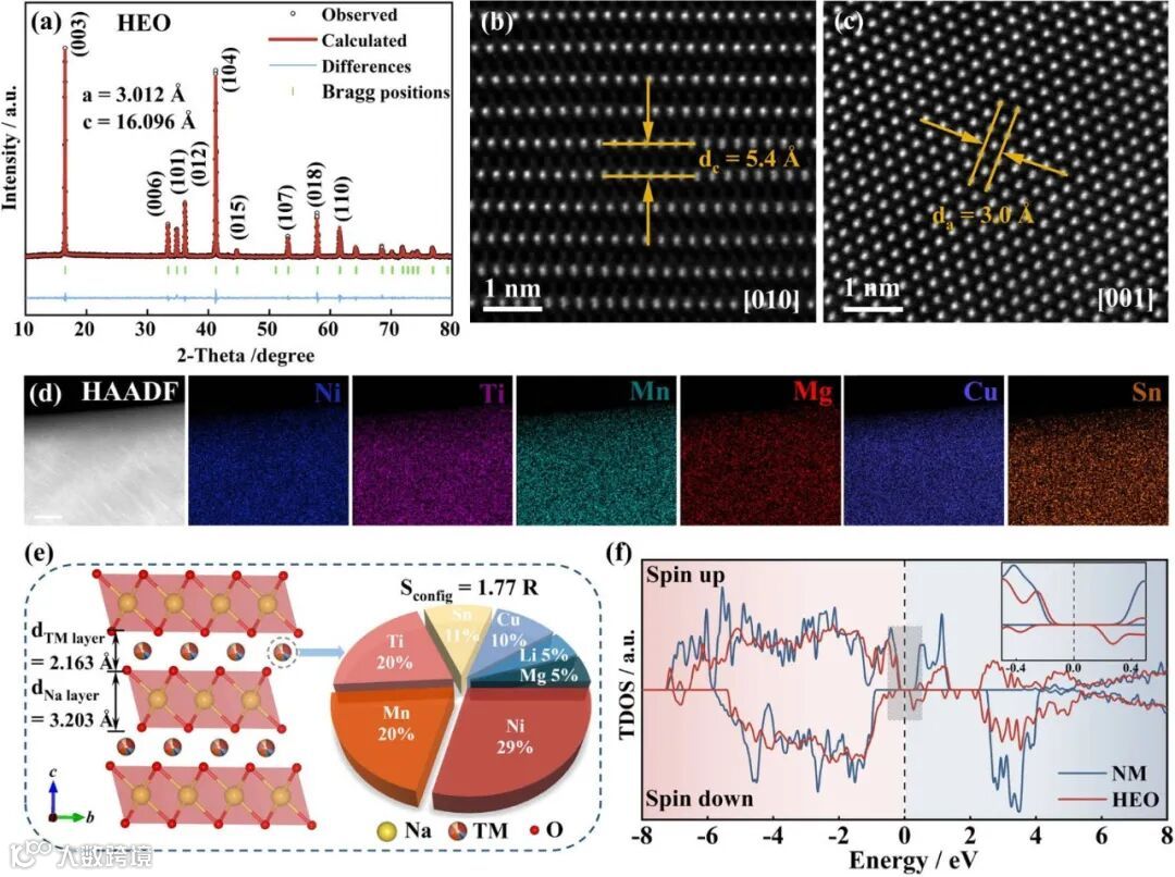 (b,c)HEO样品沿[010]和[001]晶带轴的HAADF-STEM(高角环形暗场扫描透射电子显微镜)图像。(d)HEO样品的EDS元素分布图。比例尺:50 nm。(e)HEO样品的晶体结构示意图。(f)HEO和NM样品的总态密度(TDOS)图。
