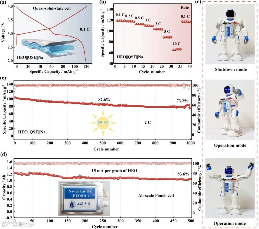 固态/准固态电池具有更优异的安全性和能量密度,因此作者通过原位热聚合的方式构建了HEO||QSE||Na准固态电池,在室温下(25℃)发挥出1000周的超长循环寿命,同时在高温下(50℃)经过200周循环的容量保持率高达83.2%。小规模实验室合成的样品质量往往有限,不足以证明材料具备大规模应用前景,因此,作者合成了公斤级样品(5kg),并在此基础上组装了Ah级软包电池,经过500周循环依然具有83.6%的高容量保持率。另外,该电池可直接驱动机器人的正常工作,充分展示出高熵材料在实际应用的巨大前景。