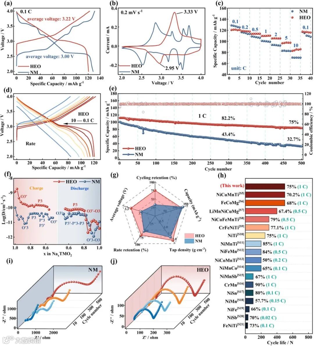 图3.(a)HEO和NM电极在2.0-4.0 V电压范围的典型充放电曲线。(b)电极的循环伏安曲线。(c)倍率性能。(d)HEO电极在不同倍率条件下的充放电曲线。(e)在1 C倍率下HEO和NM电极的循环性能比较。(f)HEO和NM电极中Na⁺扩散系数的对比。(g)综合性能的雷达图对比。(h)与文献中报道的O3型正极材料的循环寿命对比。(i,j)HEO和NM电极在不同循环次数后的阻抗图。