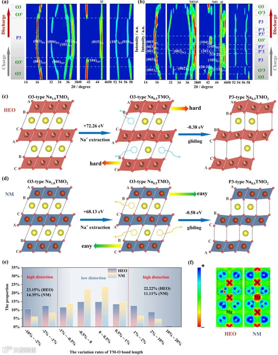 图4.(a,b)HEO和NM电极在首次充放电(2.0-4.0 V)过程中原位XRD数据的等高线图。(c,d)基于DFT计算模拟的HEO和NM脱钠过程及层间滑移过程的示意图。(e)HEO和NM中O3型Na0.5TMO₂与P3型Na0.5TMO₂中TM-O键长变化率的分布图。(f)O3型Na1.0TMO₂(HEO和NM)结构中变形电荷密度的2D投影图。